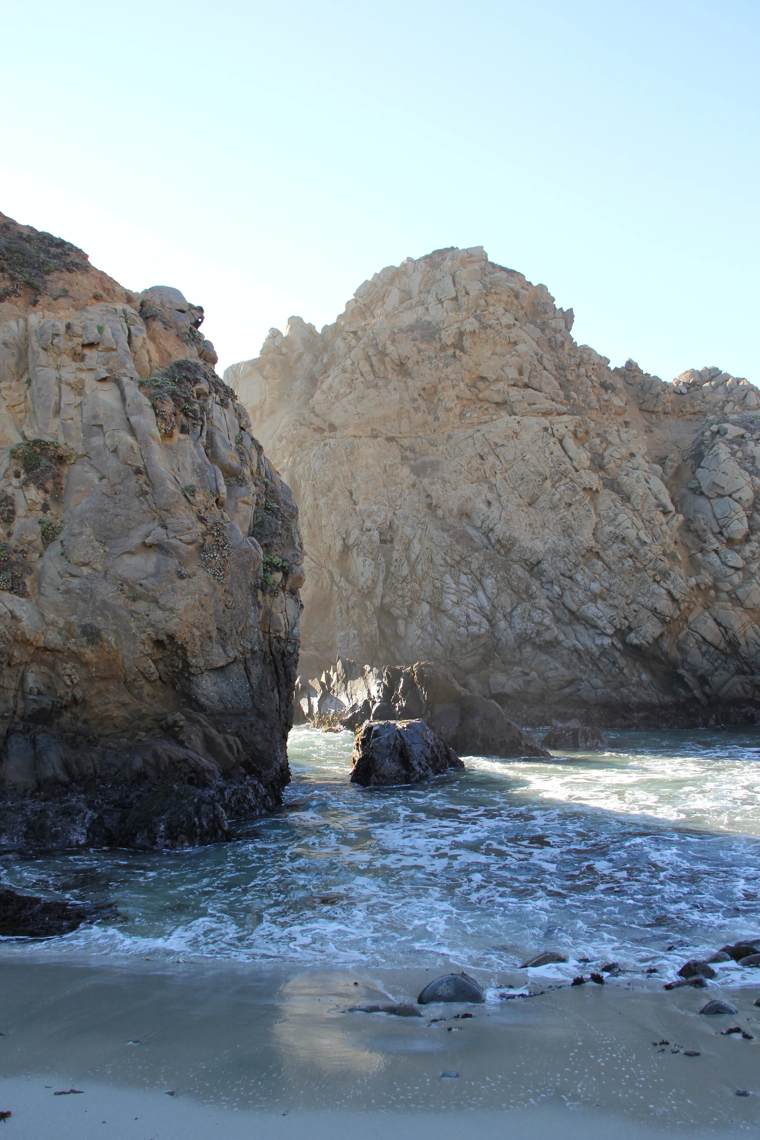 We headed further north, passing Julia Pfieffer Burns State Park (this is better visited in the afternoon when the main attraction, McWay Falls, isn’t bathed in shadows), and pulling into Pfieffer Big Sur State Park. Two miles of hiking later and we saw Pfieffer Falls and a view of the valley from a vista at the end of Valley View Trail. We ate our almond butter and raspberry preserve sandwiches along Gorge Trail next to the Big Sur river.